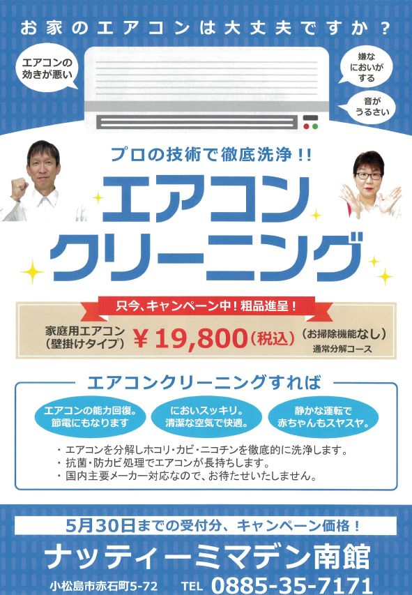 今年も暑くなりそうですね!ナッティーミマデン南館では5月30日まで「エアコンクリーニング」のキャンペーンを実施しています!